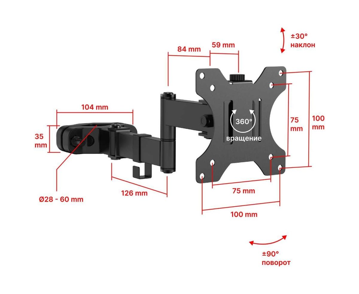 Наклонно-поворотный кронштейн с возможностью крепления к трубе диаметром от 28 до 60 мм. Натрубное крепление FMP1075 для телевизора или монитора надежно в работе и безопасно в регулировке. При помощи настроечных винтов, можно отрегулировать усилие сдвига монитора: от неподвижного состояния до самого легкого. Возможно крепление кронштейна как на вертикальную, так и на горизонтальную трубчатую конструкцию.