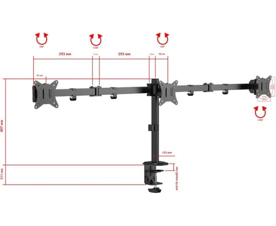 Тип кронштейна: Настольный со струбциной для трех мониторов с расположением в горизонтальной плоскости