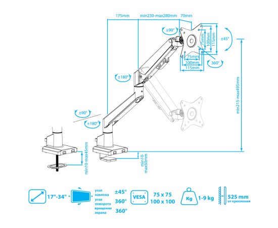 Вид кронштейна: Выдвижной, Наклонный, Поворотный, С перемещением по вертикали, положение панели портрет/альбом