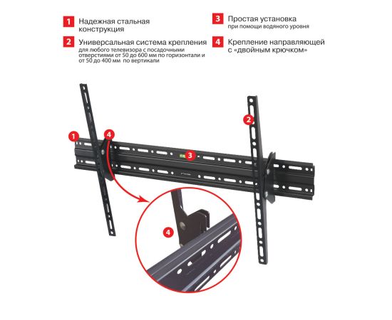 Особенности: Надежная стальная конструкция. Универсальная система крепления. Простая установка при помощи водяного уровня. Усиленное крепление направляющей двойным крючком.