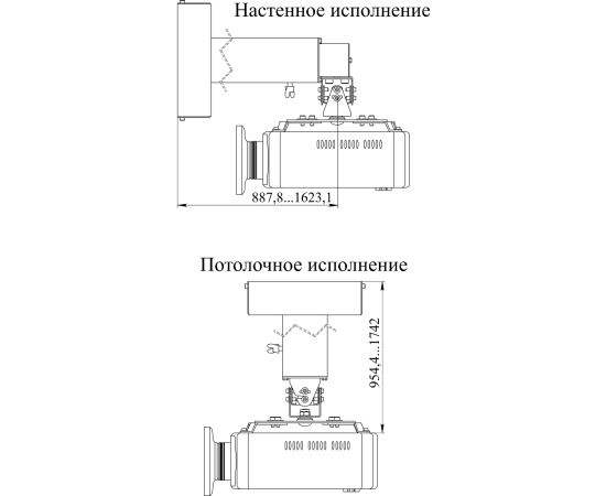 Диапазон регулировок по расстоянию: от потолка при вертикальном креплении - 955-1740 мм / от стены при горизонтальном креплении - 890-1620 мм.