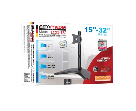 Кронштейн для мониторов Arm Media LCD-T51 черный 15"-32" макс.10кг настольный поворот и наклон верт.перемещ.