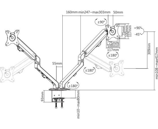 Настольный кронштейн с двумя креплениями под мониторы. Пружинный механизм позволяет легко перемещаться вверх и вниз.