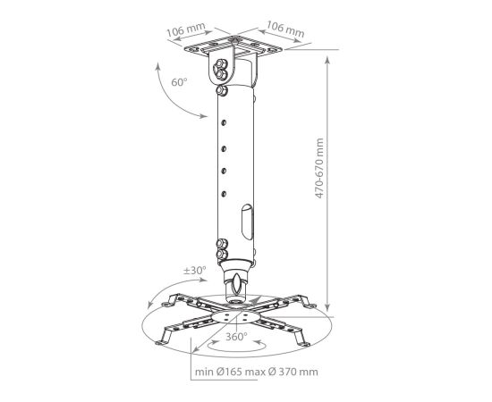 Описание: Универсальный потолочный кронштейн для проекторов с максимально удобной системой установки наклона и поворота. Прочная конструкция позволит надежно закрепить проектор. Регулируемое расстояние от потолка до проектора 470-670 мм.