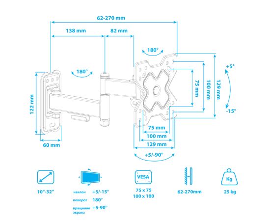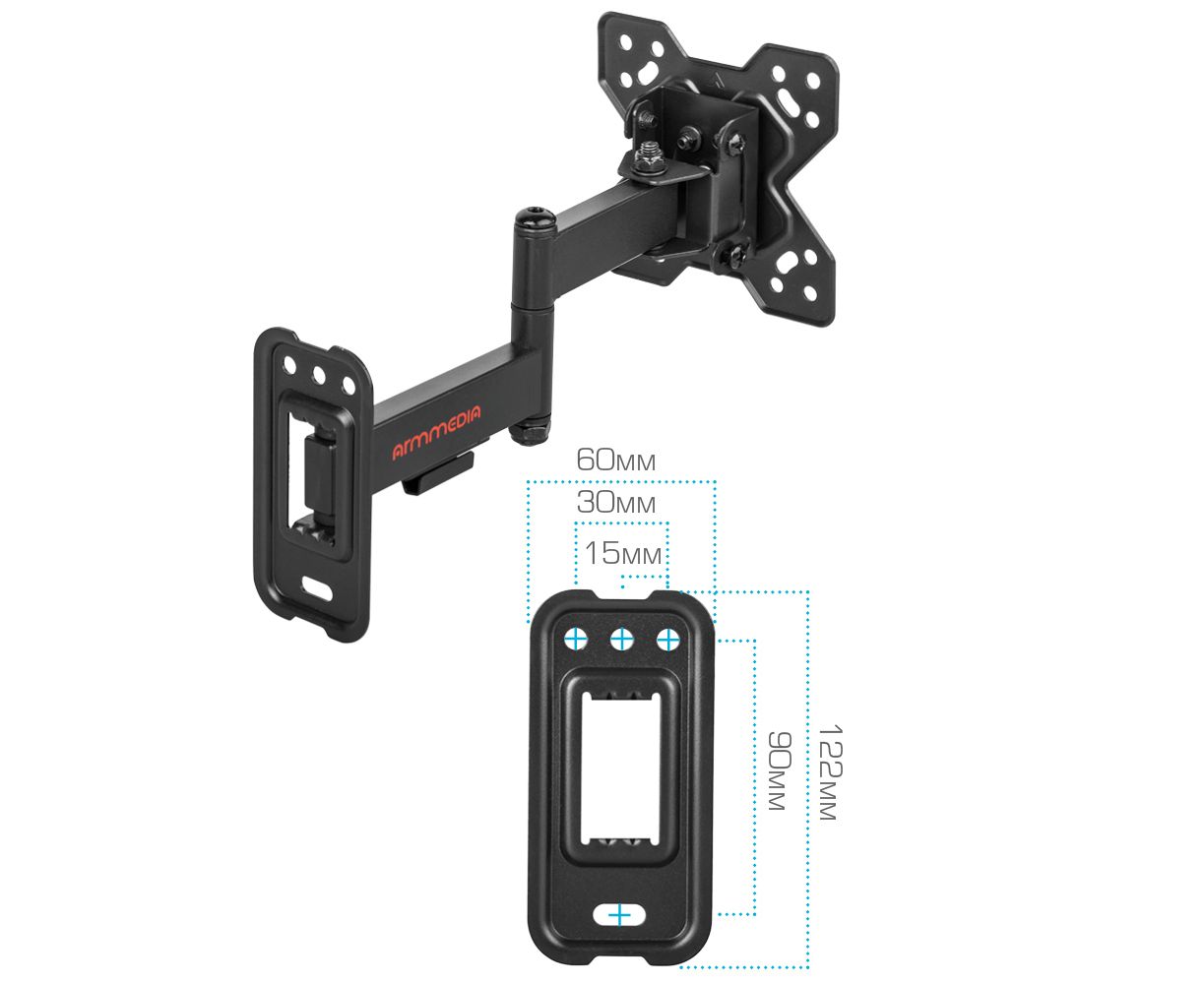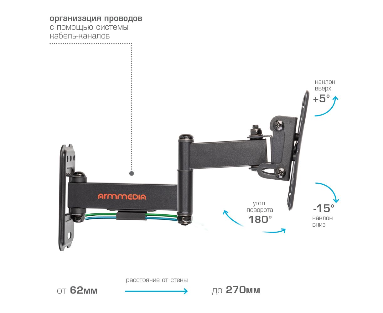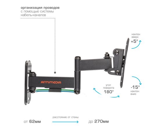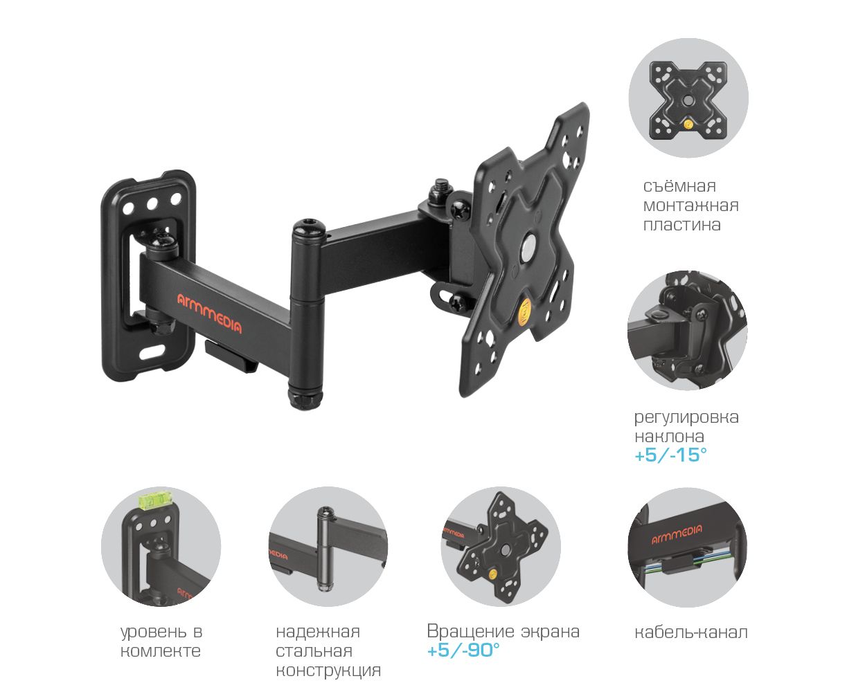 Надежная стальная конструкция, Универсальный - телевизор на кронштейне можно наклонить, повернуть и сдвинуть к стене, Легкий монтаж телевизора - благодаря наличию съемной монтажной пластины, Кабель-канал, Вращение экрана +5° -90°