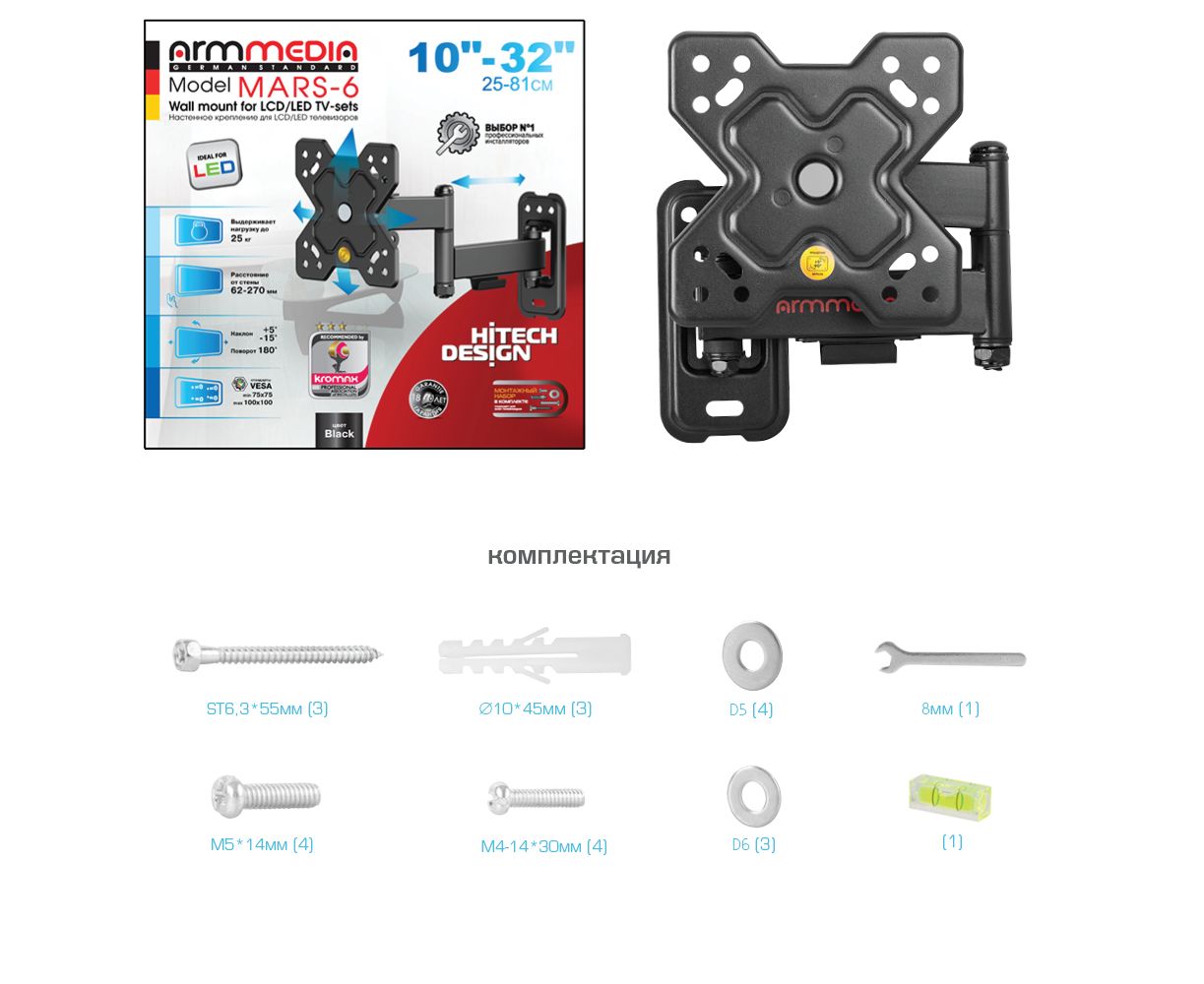 Кронштейн для телевизора, комплект ключей и крепежа для установки ТВ, навесной уровень, подробная инструкция на русском языке