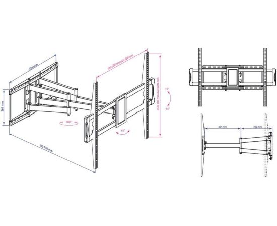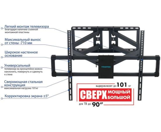 Описание Легкий монтаж телевизора благодаря наличию съемной монтажной пластины. Максимальный вынос от стены -710 мм. Универсальный — телевизор на кронштейне можно наклонить, повернуть и сдвинуть к стене. Сверхмощная стальная конструкция максимальная нагрузка 101 кг. Корректировка экрана ±5.