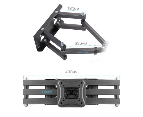 Надежная стальная конструкция максимальная нагрузка до 50 кг, Универсальная система крепления, Легкий монтаж при помощи съемной монтажной пластины, Вращение экрана уникальная возможность вращения экрана на ±5° относительно стены