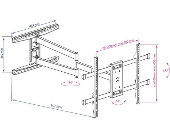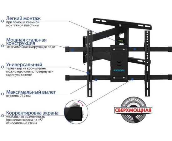 Описание Легкий монтаж при помощи съемной монтажной пластины. Мощная стальная конструкция. Универсальный телевизор на кронштейне можно наклонить, повернуть и сдвинуть к стене. Максимальный вылет от стены 712 мм. Корректировка экрана уникальная возможность вращения экрана на ±5° относительно стены.