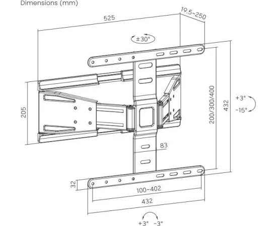Расстояние телевизора от стены: 20-250 мм;