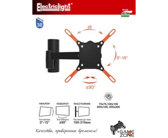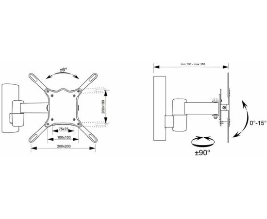 поворот: ±90°; регулировка наклона: 0°-15°; корректировка экрана по горизонтали: ±6°; минимальное расстояние от стены: 100мм; максимальное расстояние от стены: 310мм