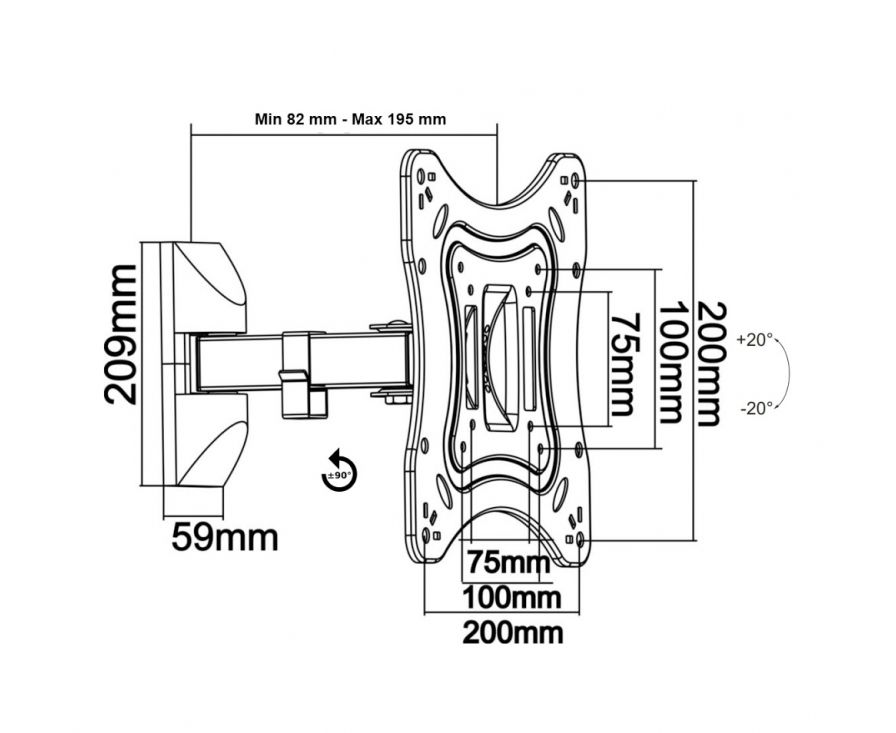 13"-42" Кронштейн ITech LCD22B Наклонно-поворотный Чёрный Нагрузка: до 20 кг Наклон: +20°~-20° Поворот: 90 град Отступ от стены: 82~195 мм VESA: 200x200