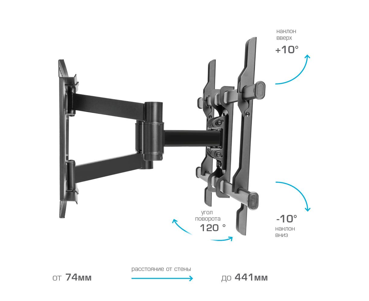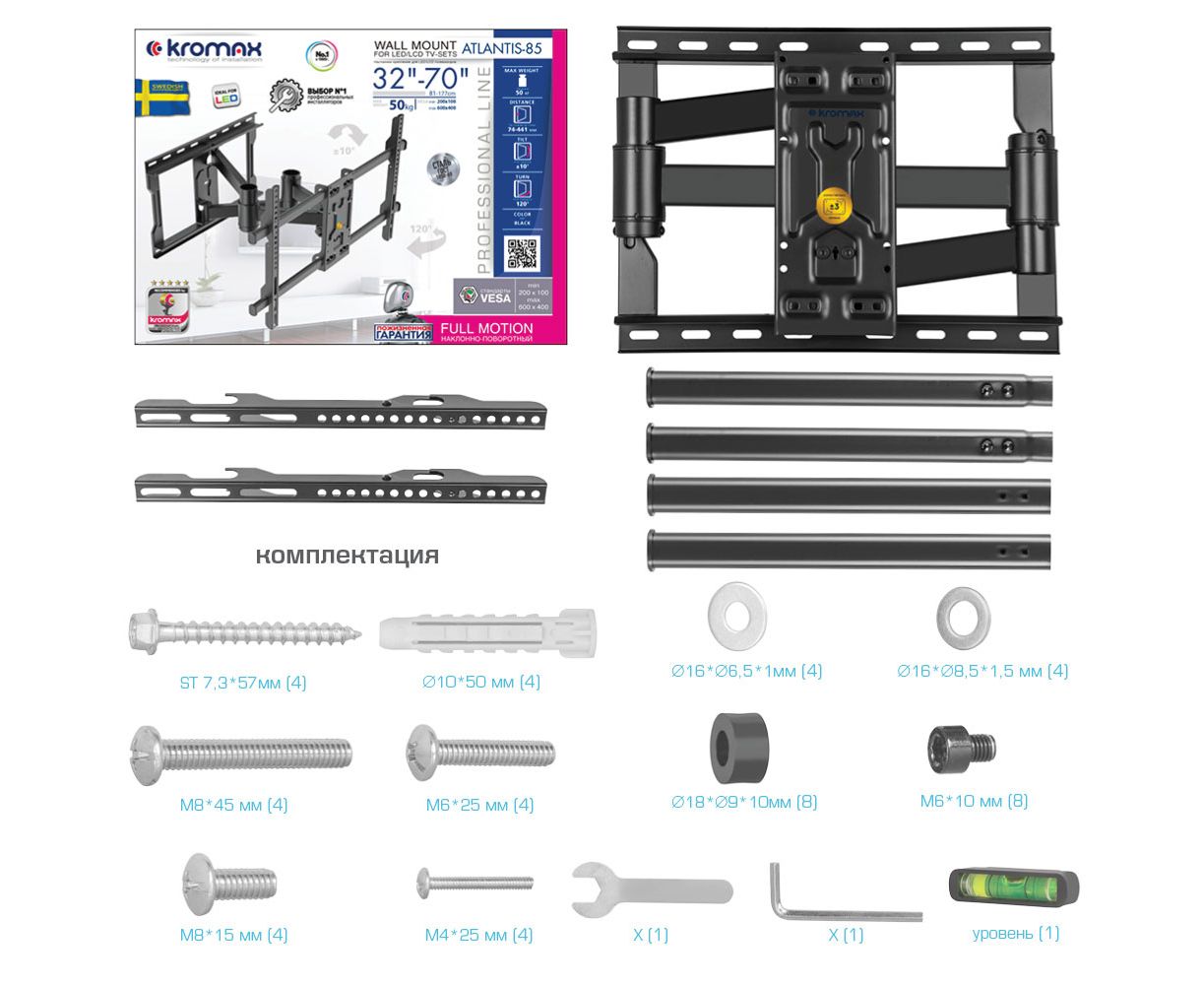 KROMAX ATLANTIS-85 BLACK надёжно удержит экран размером 32"-70" дюйма и весом 50 кг. Простая конструкция KROMAX ATLANTIS-85 BLACK идеально подойдет для самостоятельного монтажа. Наклонно-поворотная регулировка позволит наклонять вверх и вниз на ±10°, поворачивать влево и вправо на 120°, и выдвигать на 74-441 мм.