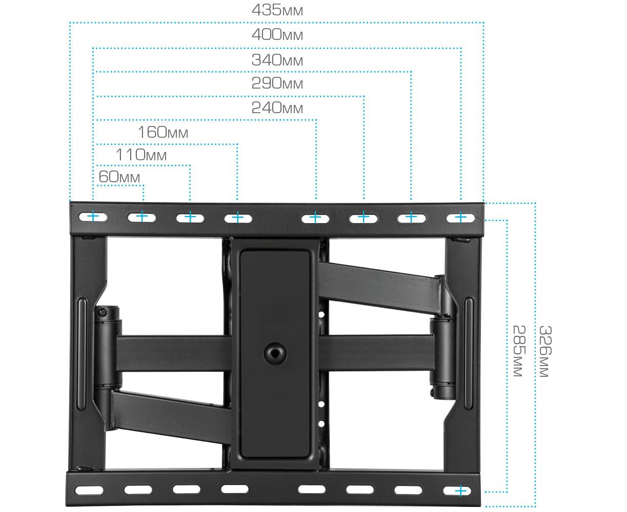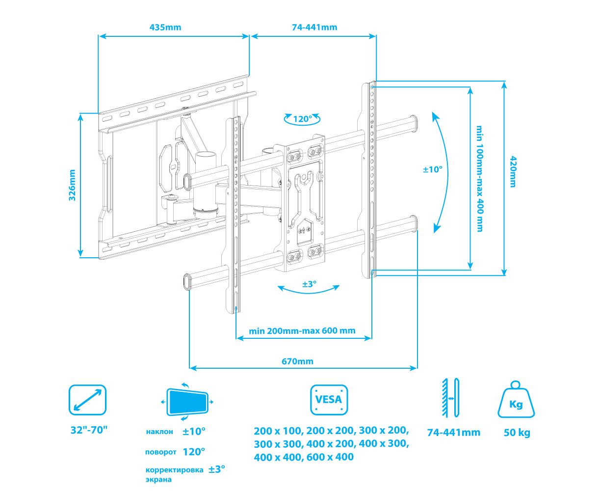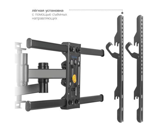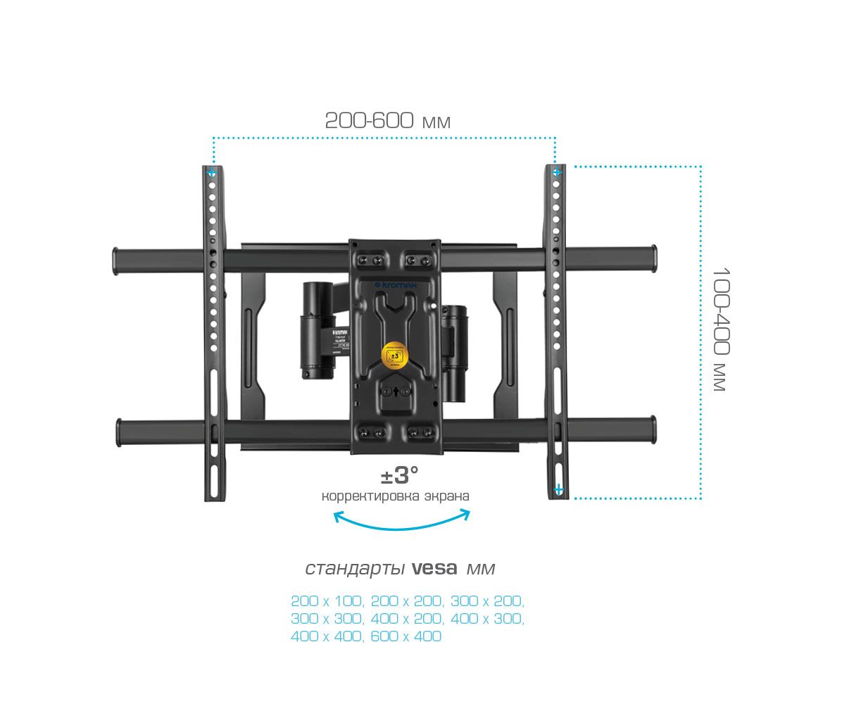 Надежная стальная конструкция максимальная нагрузка до 50 кг, Легкий монтаж при помощи съемной монтажной платформы, Универсальный - телевизор на кронштейне можно наклонить, повернуть и сдвинуть к стене , Корректировка экрана уникальная возможность вращения экрана на ±3° относительно стены