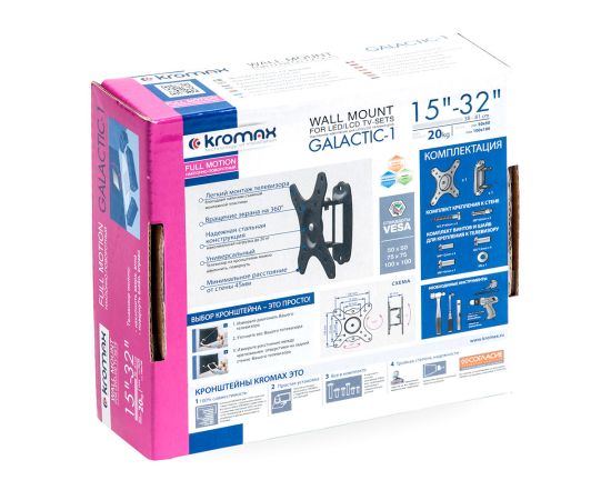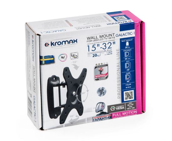 15"-32" Кронштейн Kromax GALACTIC-1 new Наклонно-поворотный Чёрный макс.20кг VESA 100x100 мм.
