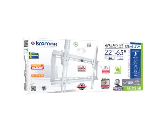 22"-65" Кронштейн Kromax IDEAL-4w белый, max 50 кг, 1 ст св., нак. 0°-10°, от ст. 23 мм, max VESA 400x400 мм.