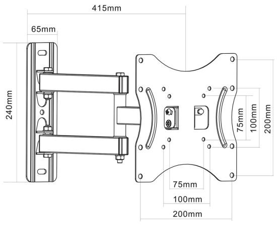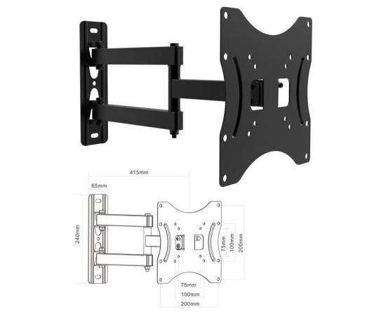 Кронштейн имеет стандарт крепления VESA 200x200, что позволяет использовать его с большинством современных телевизоров. Расстояние от стены до телевизора может варьироваться от 70 до 415 мм, что обеспечивает гибкость при установке.