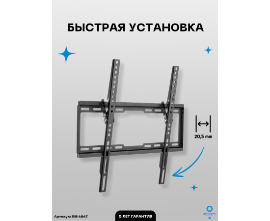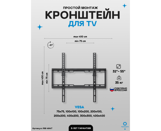 Наклонный кронштейн ''remounts RM 404T'' предназначен для ТВ с диагональю от 32 до 55 дюймов. Подходит для небольших телевизоров и мониторов весом до 35 кг. Угол наклона от 0 до -8 градусов. Вылет от стены 19,5 мм. Крепление стандарта VESA 100х100, 200х100, 200х200, 300х200, 300х300, 400х300, 400х400 мм. Толщина металла 2 мм. Совместимость с большинством стандартов крепления ТВ.