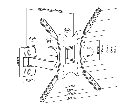 VESA: 100x100, 200x100, 200x200, 300x200, 300x300, 400x200, 400x400