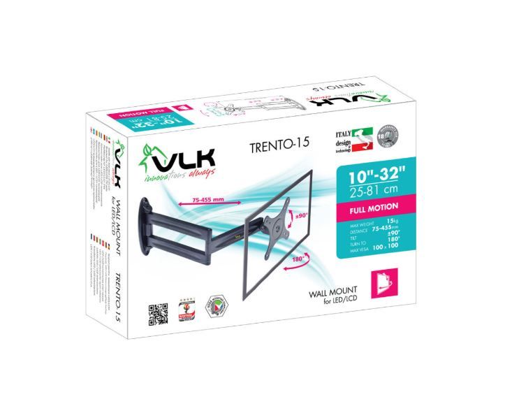 10"-32" Кронштейн VLK TRENTO-15 black Наклонно-поворотный max 15 кг, 5 ст св., нак. ±22° пов. 180° от ст. 75-455 мм. max VESA 100x100 мм.