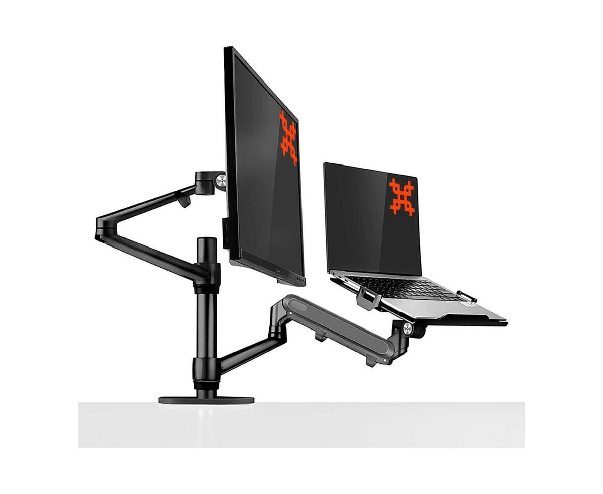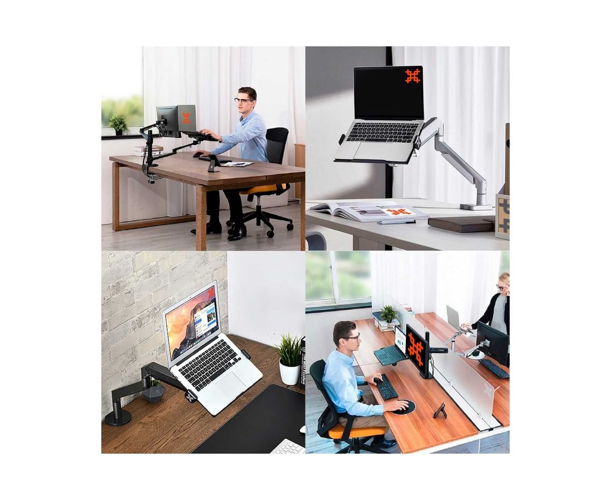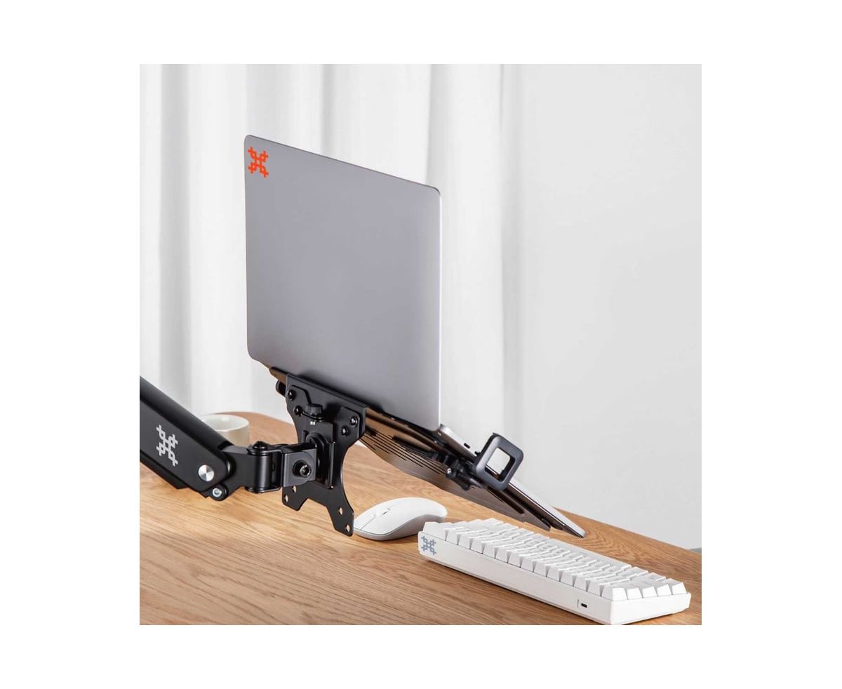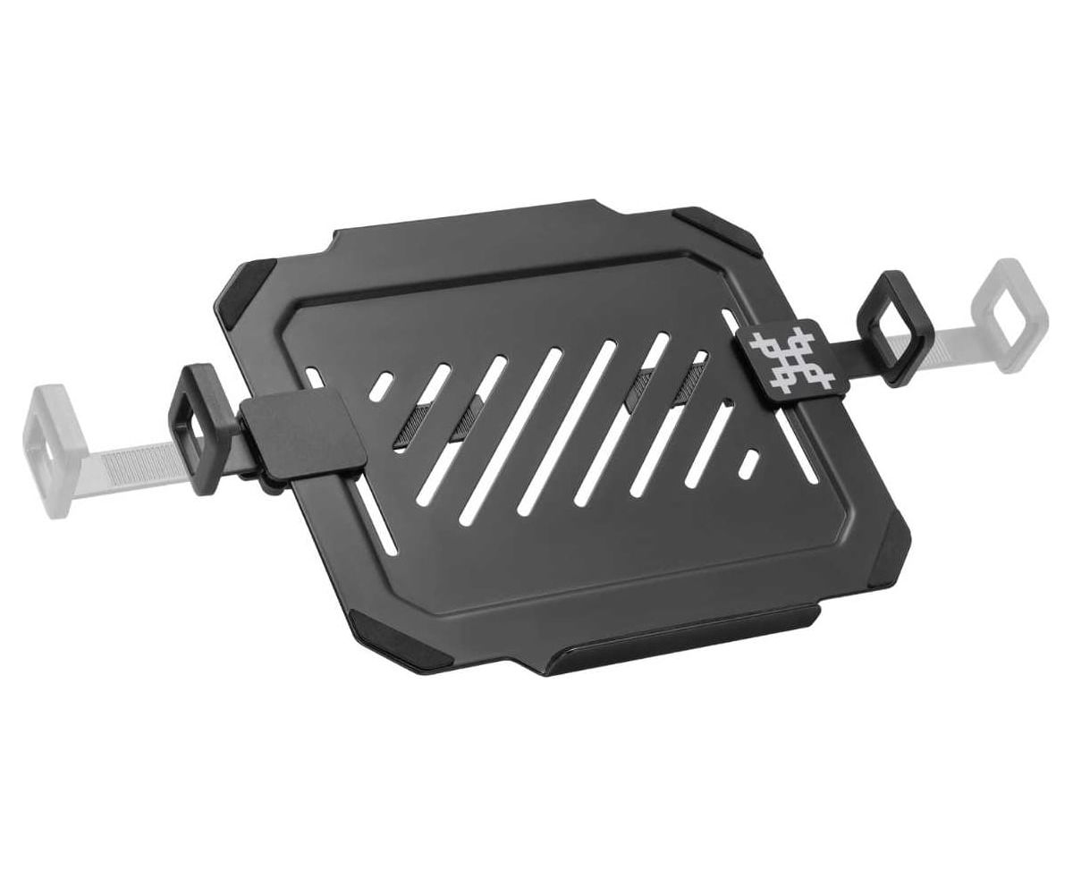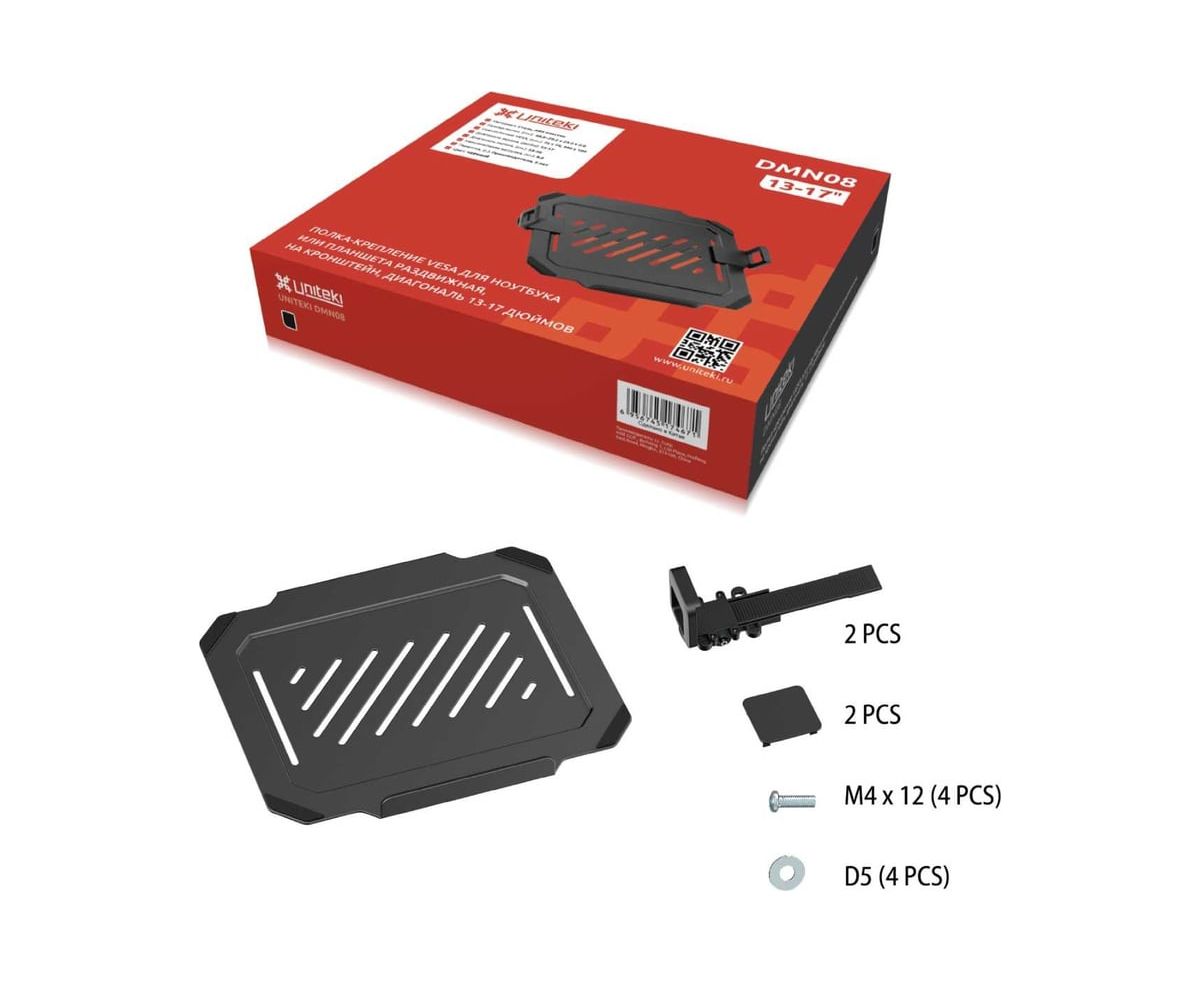 Универсальное крепление для ноутбука или планшета UNITEKI DMN08, которое устанавливается как дополнительный аксессуар на настольные, настенные, наклонно поворотные кронштейны UNITEKI, FMG, FMGT, FM, FMP, FMT, в том числе и кронштейны системы газ лифт.