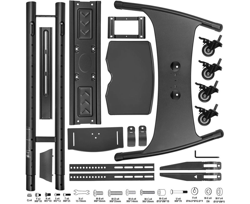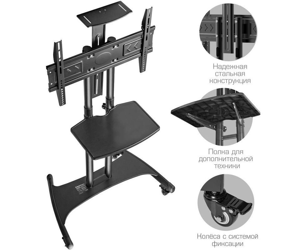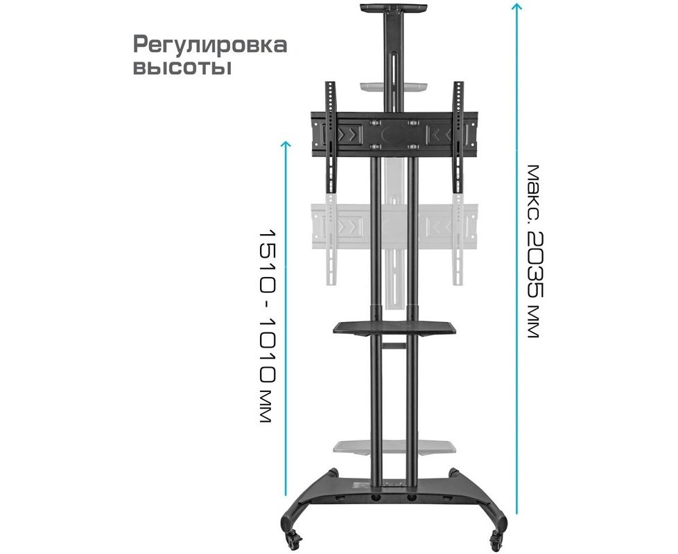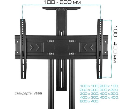 Универсальная система крепления для любого телевизора с посадочными отверстиями по горизонтали от 100 мм до 600 мм, по вертикали от 100 мм до 400 мм, Надежная стальная конструкция, Регулируемая высота до 2035 мм, Кабель канал удобная прокладка соединительных кабелей внутри штанги