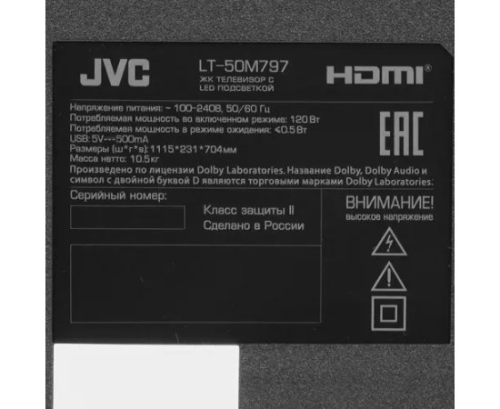 JVC LT-50M797 – это телевизор с диагональю экрана 50" (125 см) в черном корпусе. Он поддерживает воспроизведение видео в разрешении 4K (3840x2160). За качественное звуковое сопровождение при просмотре видео отвечает акустическая система с выходной мощностью звука 24 Вт, поддержкой технологии звука Dolby Digital. Для подключения видеотехники модель использует 4 разъема HDMI, а к порту USB можно подключить накопители памяти, цифровую или мобильную технику.