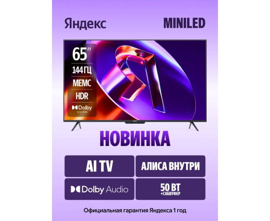 65" Телевизор YANDEX YNDX-00104 черный QLED 3840x2160, 4K Ultra HD, 120 Гц, WIFI, SMART TV, Яндекс ТВ Станция Про