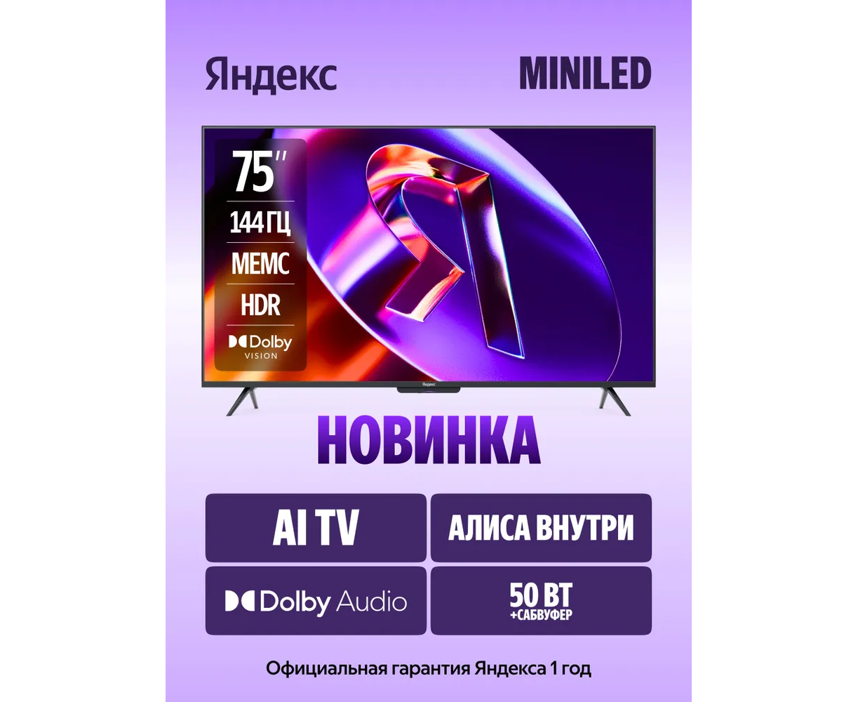 75" Телевизор YANDEX YNDX-00105 черный QLED 3840x2160, 4K Ultra HD, 120 Гц, WIFI, SMART TV, Яндекс ТВ Станция Про
